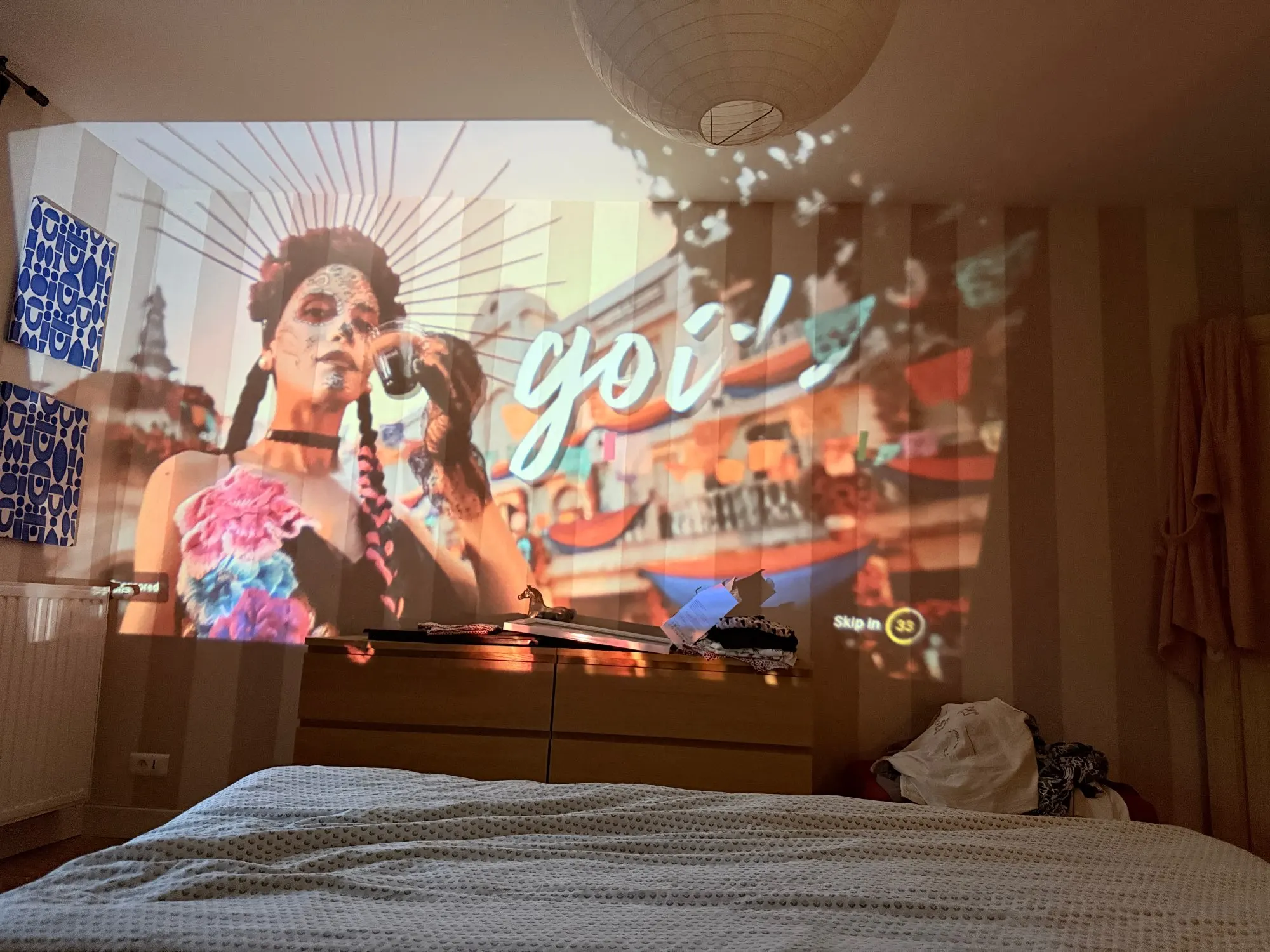 Tu mayor beneficio para cuartos pequeños. Proyecta en el techo mientras estás acostado. Su diseño giratorio elimina la necesidad de soportes complicados.